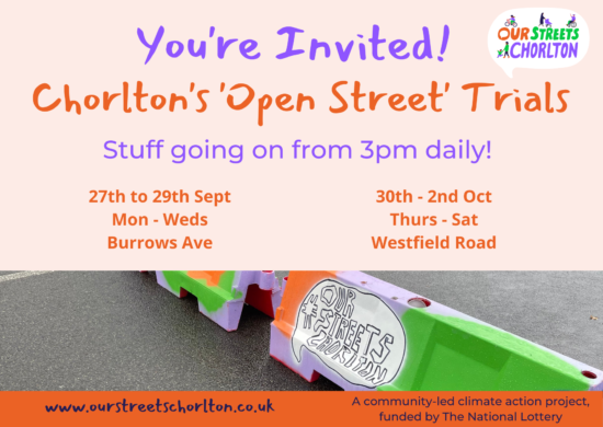 Open Streets have arrived in Chorlton this week. This time for 6 whole days! Come to Burrows Ave from Monday and Westfield Road from Thursday to join the conversation!